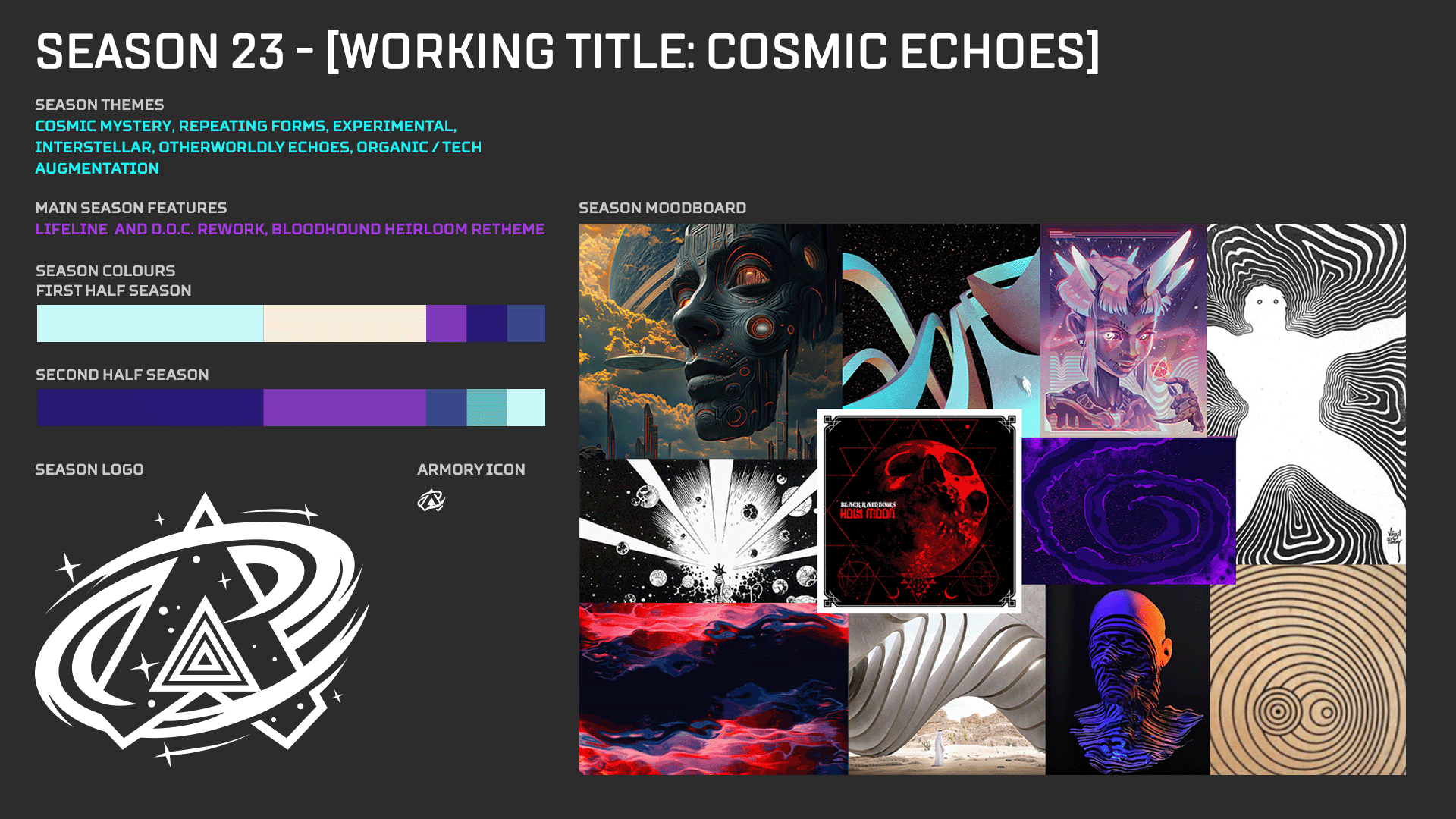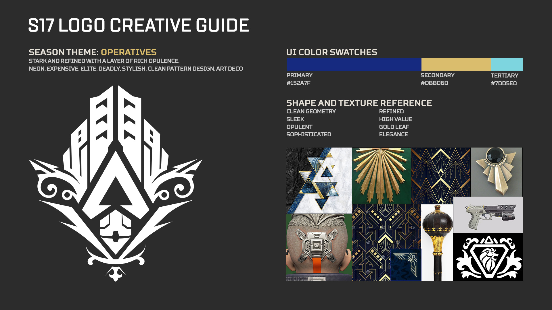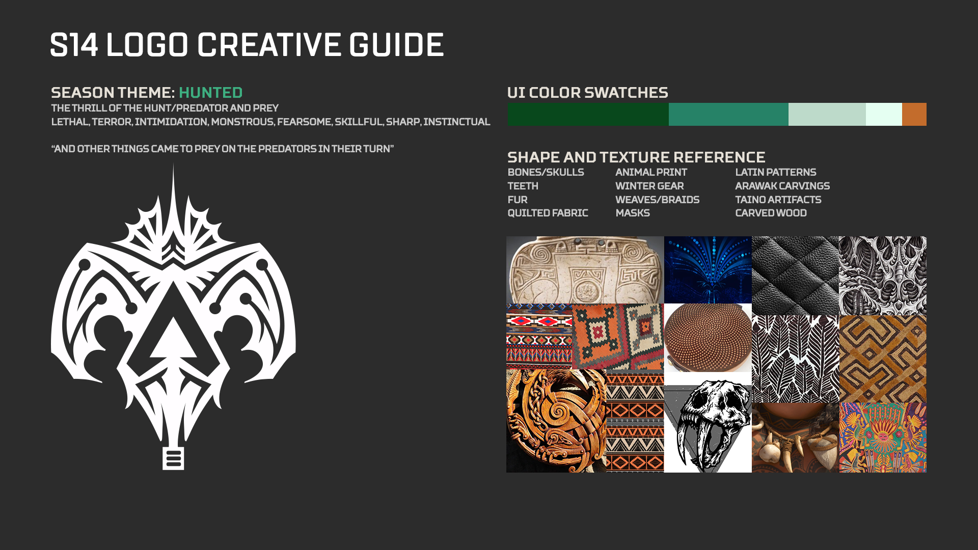 As a live service game, Apex operates on a schedule of seasonal content. Every three months a new season starts; part of the creative output involves researching features, characters and narrative beats, weapons, and marketing themes to inform a logo design.