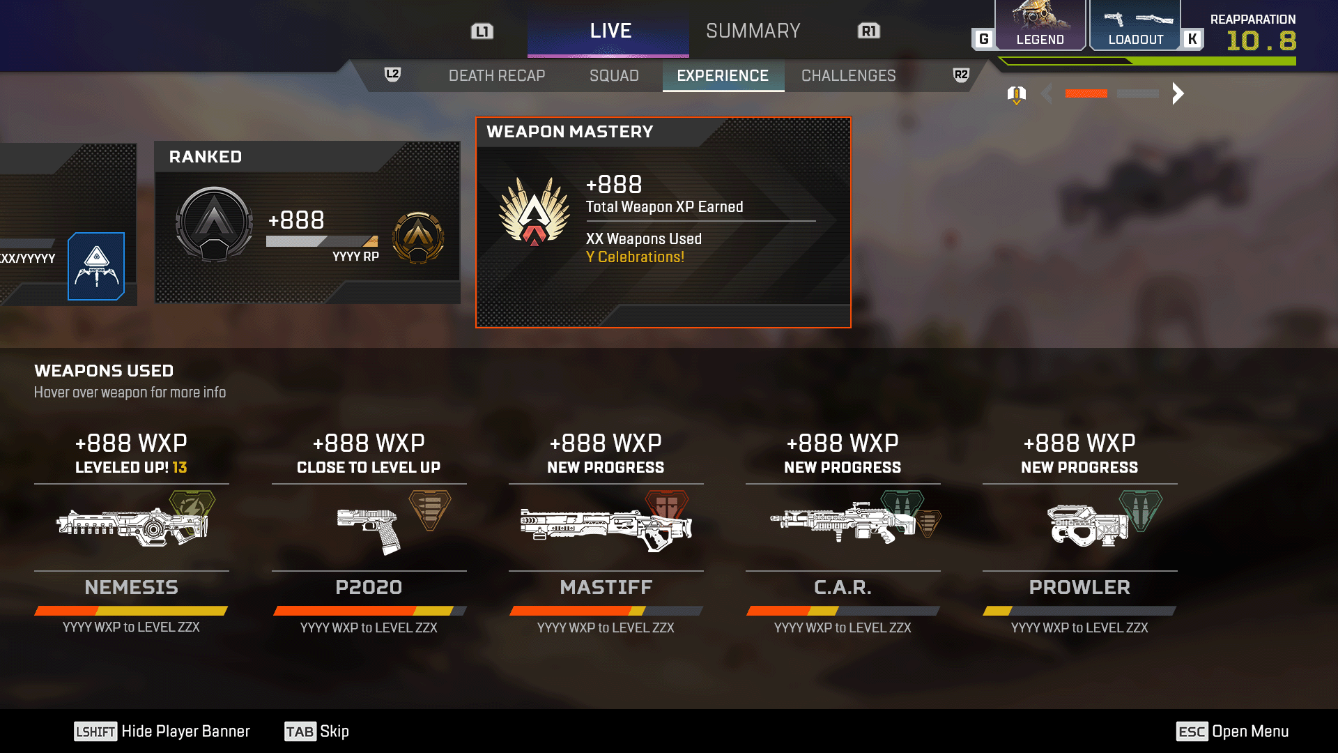 Animated content in Apex UI is used judiciously to emphasize high-value rewards and important gameplay events. Typically animations for Apex are created in either AfterEffects, for more complex and dynamic screens, or using in-house animation tools for HUD elements and badges.